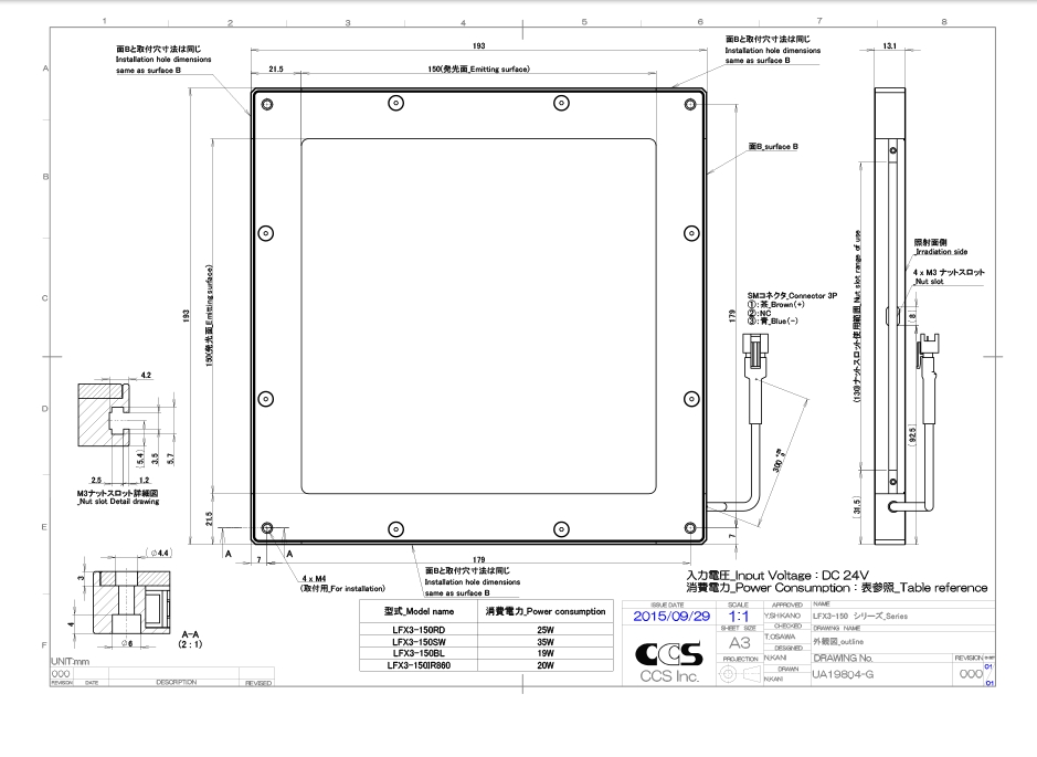 CCS希希爱视 LFX3-150BL 平面无影光源 LED发光颜色 Blue 峰值发光波长 469 nm typ. 外观尺寸 W 193 mm x D 193 mm x H 13.1 mm 输入电压 24 VDC 消耗功率 19 W max. 极性, 信号 1: (+), 2: NC, 3: (-) 线缆长度 300 mm 外壳材质 Aluminum alloy, Resin (protective plate, light-guiding diffusion plate) 输入端口 SMR-03V-B 适合规格 CE, UKCA, RoHS, IEC 62471(Exempt) 使用温湿度 Temperature: 0 to 40°C, Humidity: 20 to 85%RH (no condensation) 保存温湿度 Temperature: -20 to 60°C, Humidity: 20 to 85%RH (no condensation) 冷却方式 Natural air-cooling 重量 620 g max. 附属品 使用说明书 手机/微信:13682357734 电话:0755-84690029 QQ: 2844337877 邮箱:2844337877@qq.com...