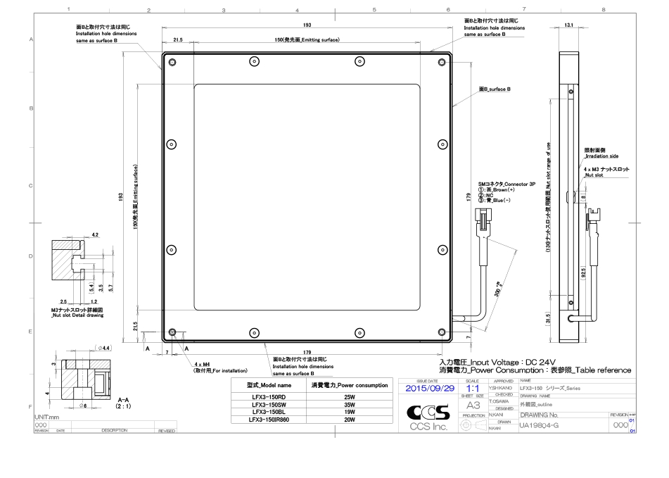 CCS希希爱视 LFX3-150RD 平面无影光源 LED发光颜色 Red 峰值发光波长 632 nm typ. 外观尺寸 W 193 mm x D 193 mm x H 13.1 mm 输入电压 24 VDC 消耗功率 25 W max. 极性, 信号 1: (+), 2: NC, 3: (-) 线缆长度 300 mm 外壳材质 Aluminum alloy, Resin (protective plate, light-guiding diffusion plate) 输入端口 SMR-03V-B 适合规格 CE, UKCA, RoHS, IEC 62471(Exempt) 使用温湿度 Temperature: 0 to 40°C, Humidity: 20 to 85%RH (no condensation) 保存温湿度 Temperature: -20 to 60°C, Humidity: 20 to 85%RH (no condensation) 冷却方式 Natural air-cooling 重量 620 g max. 附属品 使用说明书 手机/微信:13682357734 电话:0755-84690029 QQ: 2844337877 邮箱:2844337877@qq.com...