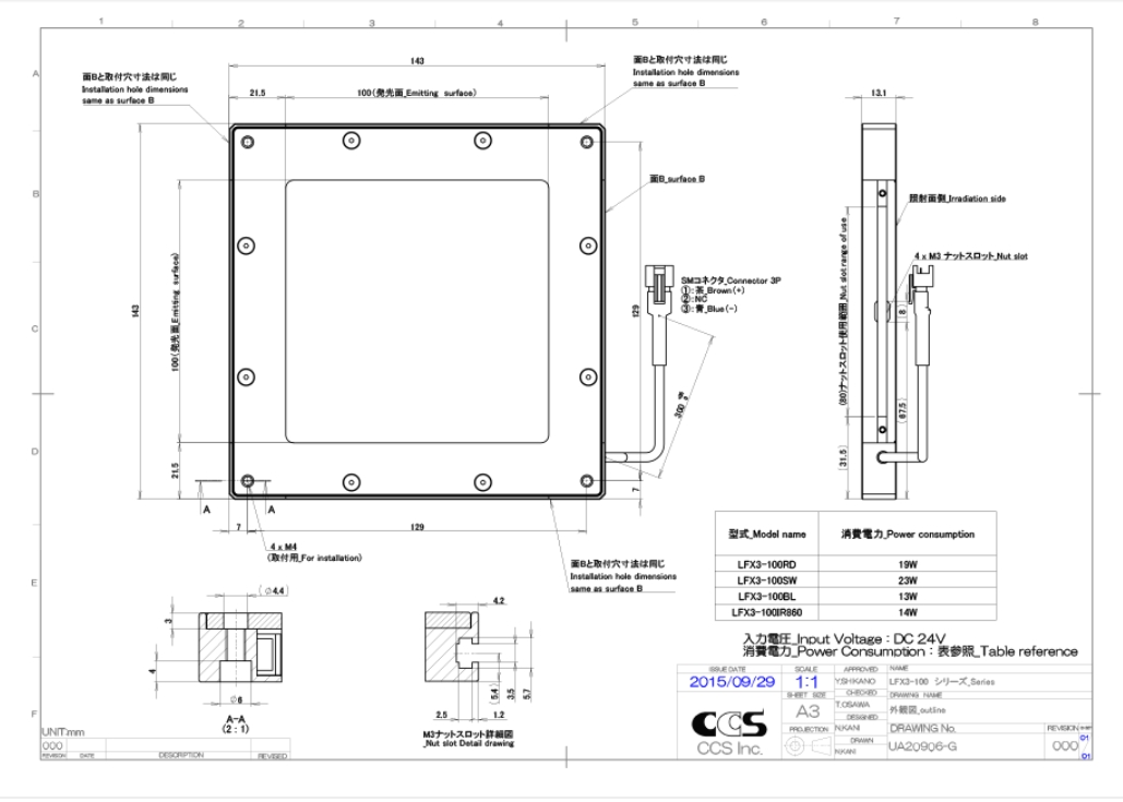 CCS希希爱视 LFX3-100IR860 平面无影光源 LED发光颜色 Infrared 峰值发光波长 857 nm typ. 外观尺寸 W 143 mm x D 143 mm x H 13.1 mm 输入电压 24 VDC 消耗功率 14 W max. 极性, 信号 1: (+), 2: NC, 3: (-) 线缆长度 300 mm 外壳材质 Aluminum alloy, Resin (protective plate, light-guiding diffusion plate) 输入端口 SMR-03V-B 适合规格 CE, UKCA, RoHS, IEC 62471(Exempt) 使用温湿度 Temperature: 0 to 40°C, Humidity: 20 to 85%RH (no condensation) 保存温湿度 Temperature: -20 to 60°C, Humidity: 20 to 85%RH (no condensation) 冷却方式 Natural air-cooling 重量 400 g max. 附属品 使用说明书 手机/微信:13682357734 电话:0755-84690029 QQ: 2844337877 邮箱:2844337877@qq.com...