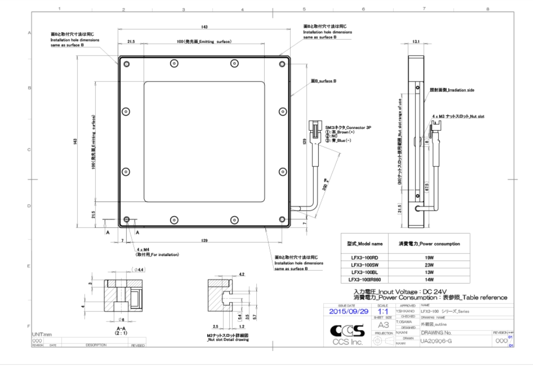 CCS希希爱视 LFX3-100BL 平面无影光源 LED发光颜色 Blue 峰值发光波长 469 nm typ. 外观尺寸 W 143 mm x D 143 mm x H 13.1 mm 输入电压 24 VDC 消耗功率 13 W max. 极性, 信号 1: (+), 2: NC, 3: (-) 线缆长度 300 mm 外壳材质 Aluminum alloy, Resin (protective plate, light-guiding diffusion plate) 输入端口 SMR-03V-B 适合规格 CE, UKCA, RoHS, IEC 62471(Exempt) 使用温湿度 Temperature: 0 to 40°C, Humidity: 20 to 85%RH (no condensation) 保存温湿度 Temperature: -20 to 60°C, Humidity: 20 to 85%RH (no condensation) 冷却方式 Natural air-cooling 重量 400 g max. 附属品 使用说明书 手机/微信:13682357734 电话:0755-84690029 QQ: 2844337877 邮箱:2844337877@qq.com...