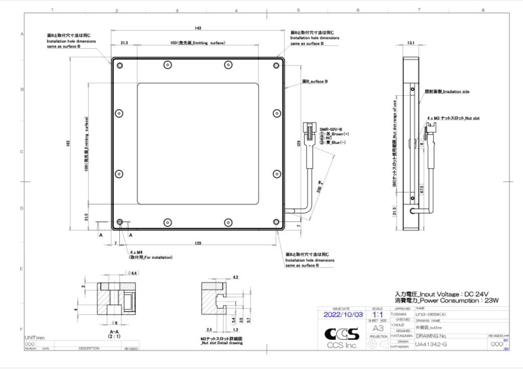 CCS希希爱视 LFX3-100SW(A) 平面无影光源 LED发光颜色 White 相关色温 6,500 K typ. 外观尺寸 W 143 mm x D 143 mm x H 13.1 mm 输入电压 24 VDC 消耗功率 23 W max. 极性, 信号 1: (+), 2: NC, 3: (-) 线缆长度 300 mm 外壳材质 Aluminum alloy, Resin (protective plate, light-guiding diffusion plate) 输入端口 SMR-03V-B 适合规格 CE, UKCA, RoHS, IEC 62471(Exempt) 使用温湿度 Temperature: 0 to 40°C, Humidity: 20 to 85%RH (no condensation) 保存温湿度 Temperature: -20 to 60°C, Humidity: 20 to 85%RH (no condensation) 冷却方式 Natural air-cooling 重量 400 g max. 附属品 使用说明书 手机/微信:13682357734 电话:0755-84690029 QQ: 2844337877 邮箱:2844337877@qq.com...