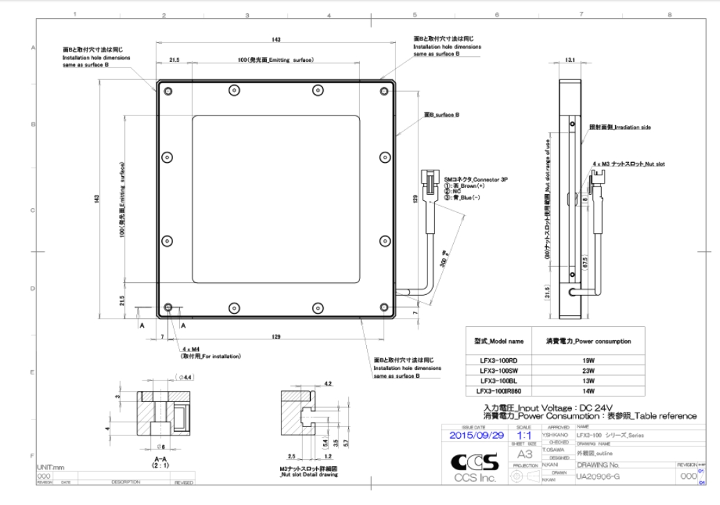 CCS希希爱视 LFX3-100RD 平面无影光源 LED发光颜色 Red 峰值发光波长 632 nm typ. 外观尺寸 W 143 mm x D 143 mm x H 13.1 mm 输入电压 24 VDC 消耗功率 19 W max. 极性, 信号 1: (+), 2: NC, 3: (-) 线缆长度 300 mm 外壳材质 Aluminum alloy, Resin (protective plate, light-guiding diffusion plate) 输入端口 SMR-03V-B 适合规格 CE, UKCA, RoHS, IEC 62471(Exempt) 使用温湿度 Temperature: 0 to 40°C, Humidity: 20 to 85%RH (no condensation) 保存温湿度 Temperature: -20 to 60°C, Humidity: 20 to 85%RH (no condensation) 冷却方式 Natural air-cooling 重量 400 g max. 附属品 使用说明书 手机/微信:13682357734 电话:0755-84690029 QQ: 2844337877 邮箱:2844337877@qq.com...