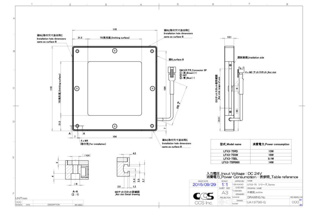 CCS希希爱视 LFX3-75IR860 平面无影光源 LED发光颜色 Infrared 峰值发光波长 857 nm typ. 外观尺寸 W 118 mm x D 118 mm x H 13.1 mm 输入电压 24 VDC 消耗功率 14 W max. 极性, 信号 1: (+), 2: NC, 3: (-) 线缆长度 300 mm 外壳材质 Aluminum alloy, Resin (protective plate, light-guiding diffusion plate) 输入端口 SMR-03V-B 适合规格 CE, UKCA, RoHS, IEC 62471(Exempt) 使用温湿度 Temperature: 0 to 40°C, Humidity: 20 to 85%RH (no condensation) 保存温湿度 Temperature: -20 to 60°C, Humidity: 20 to 85%RH (no condensation) 冷却方式 Natural air-cooling 重量 320 g max. 附属品 使用说明书 手机/微信:13682357734 电话:0755-84690029 QQ: 2844337877 邮箱:2844337877@qq.com...