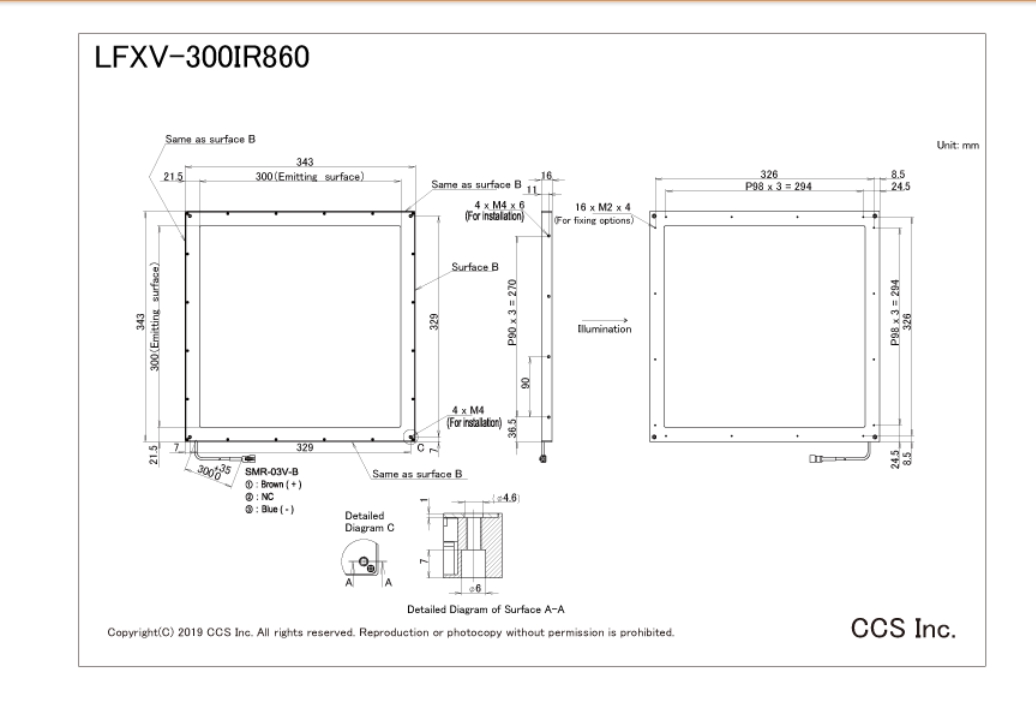 CCS希希爱视 LFXV-300IR860 平面无影光源 LED发光颜色 Infrared 峰值发光波长 855 nm typ. 外观尺寸 W 343 mm x D 343 mm x H 16 mm 输入电压 24VDC 消耗功率 34 W max. 极性, 信号 1: (+), 2: NC, 3: (-) 线缆长度 300 mm 外壳材质 Aluminum alloy, Resin (protective plate, light-guiding plate) 输入端口 SMR-03V-B 适合规格 CE, UKCA, RoHS, IEC 62471(Exempt) 使用温湿度 Temperature: 0 to 40℃, Humidity: 20% to 85%RH (with no condensation)(indoors only) 保存温湿度 Temperature: -20 to 60°C, Humidity: 20 to 85%RH (no condensation) 冷却方式 Natural air-cooling 重量 2000 g max. 附属品 使用说明书 手机/微信:13682357734 电话:0755-84690029 QQ: 2844337877 邮箱:2844337877@qq.com...