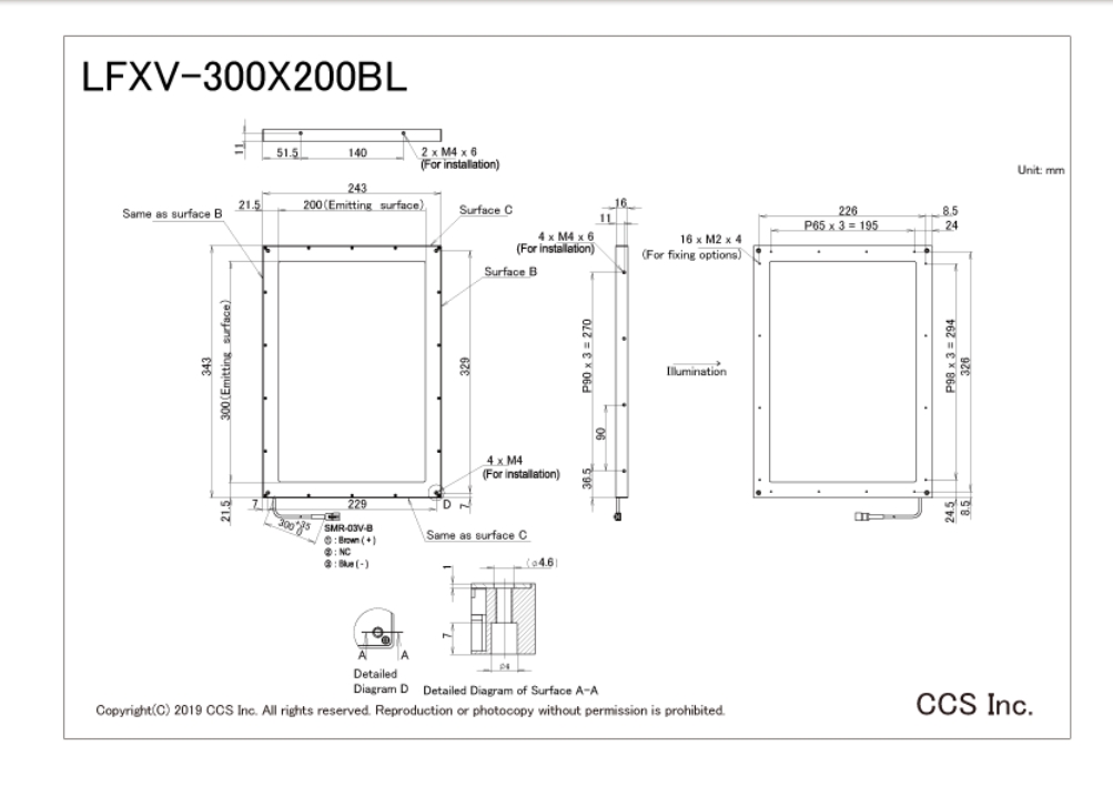 CCS希希爱视 LFXV-300X200BL 平面无影光源 LED发光颜色 Blue 峰值发光波长 465 nm typ. 外观尺寸 W 243 mm x D 343 mm x H 16 mm 输入电压 24VDC 消耗功率 47 W max. 极性, 信号 1: (+), 2: NC, 3: (-) 线缆长度 300 mm 外壳材质 Aluminum alloy, Resin (protective plate, light-guiding plate) 输入端口 SMR-03V-B 适合规格 CE, UKCA, RoHS, IEC 62471(Exempt) 使用温湿度 Temperature: 0 to 40℃, Humidity: 20% to 85%RH (with no condensation)(indoors only) 保存温湿度 Temperature: -20 to 60°C, Humidity: 20 to 85%RH (no condensation) 冷却方式 Natural air-cooling 重量 1600 g max. 附属品 使用说明书 手机/微信:13682357734 电话:0755-84690029 QQ: 2844337877 邮箱:2844337877@qq.com...