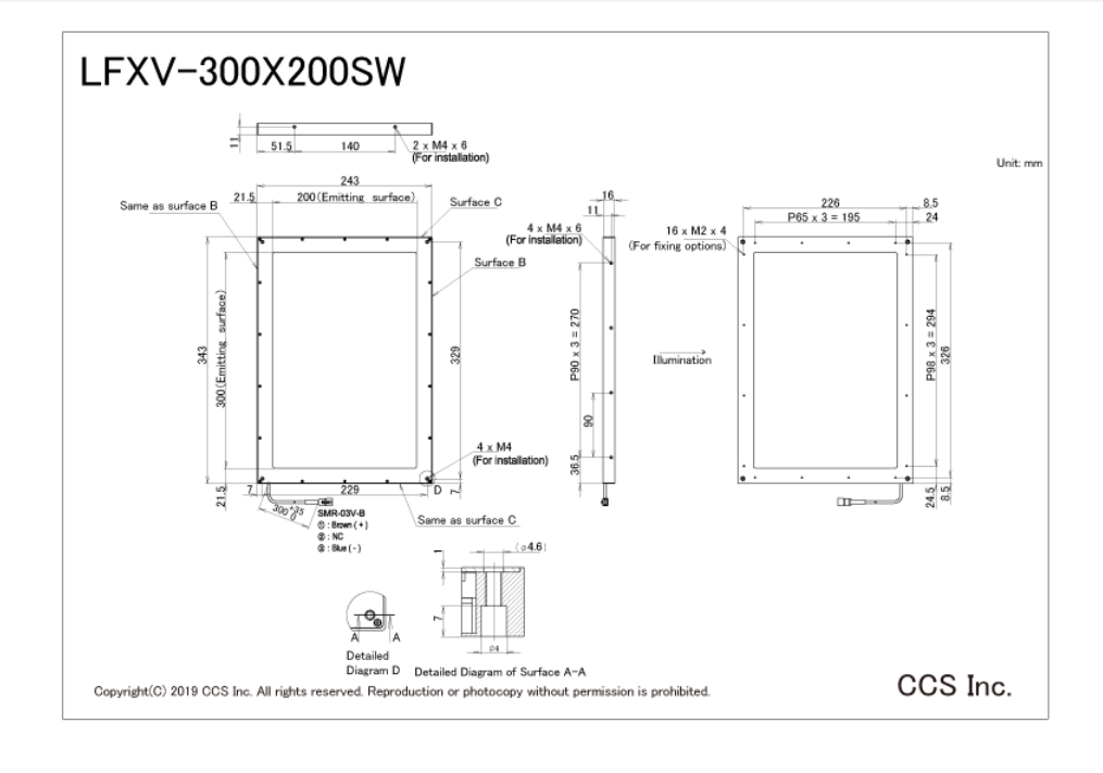 CCS希希爱视 LFXV-300X200SW 平面无影光源 LED发光颜色 White 相关色温 5,500 K typ. 外观尺寸 W 243 mm x D 343 mm x H 16 mm 输入电压 24VDC 消耗功率 50 W max. 极性, 信号 1: (+), 2: NC, 3: (-) 线缆长度 300 mm 外壳材质 Aluminum alloy, Resin (protective plate, light-guiding plate) 输入端口 SMR-03V-B 适合规格 CE, UKCA, RoHS, IEC 62471(Exempt) 使用温湿度 Temperature: 0 to 40℃, Humidity: 20% to 85%RH (with no condensation)(indoors only) 保存温湿度 Temperature: -20 to 60°C, Humidity: 20 to 85%RH (no condensation) 冷却方式 Natural air-cooling 重量 1600 g max. 附属品 使用说明书 手机/微信:13682357734 电话:0755-84690029 QQ: 2844337877 邮箱:2844337877@qq.com...