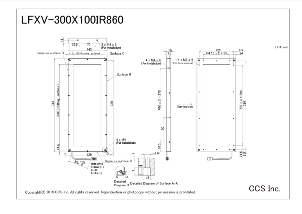 CCS希希爱视 LFXV-300X100RD 平面无影光源 LED发光颜色 Red 峰值发光波长 630 nm typ. 外观尺寸 W 143 mm x D 343 mm x H 16 mm 输入电压 24VDC 消耗功率 31 W max. 极性, 信号 1: (+), 2: NC, 3: (-) 线缆长度 300 mm 外壳材质 Aluminum alloy, Resin (protective plate, light-guiding plate) 输入端口 SMR-03V-B 适合规格 CE, UKCA, RoHS, IEC 62471(Exempt) 使用温湿度 Temperature: 0 to 40℃, Humidity: 20% to 85%RH (with no condensation)(indoors only) 保存温湿度 Temperature: -20 to 60°C, Humidity: 20 to 85%RH (no condensation) 冷却方式 Natural air-cooling 重量 1300 g max. 附属品 使用说明书 手机/微信:13682357734 电话:0755-84690029 QQ: 2844337877 邮箱:2844337877@qq.com...