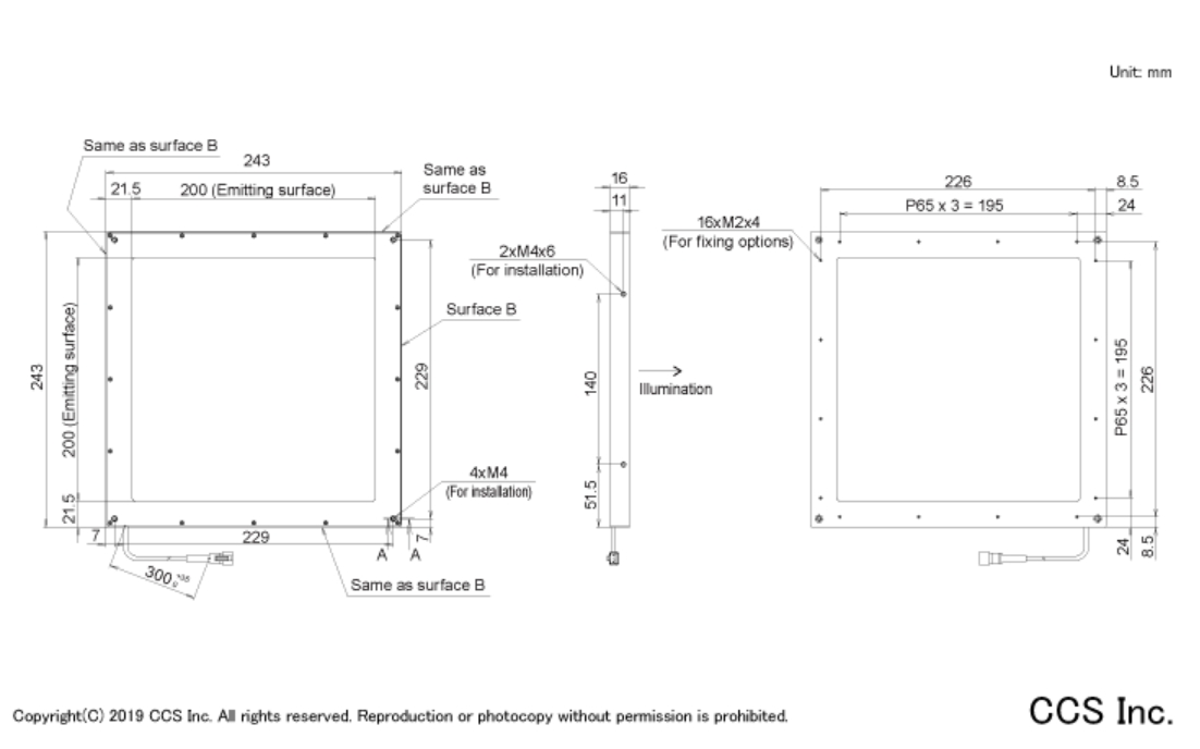 CCS希希爱视 LFXV-200BL 平面无影光源 LED发光颜色 Blue 峰值发光波长 465 nm typ. 外观尺寸 W 243 mm x D 243 mm x H 16 mm 输入电压 24VDC 消耗功率 38 W max. 极性, 信号 1: (+), 2: NC, 3: (-) 线缆长度 300 mm 外壳材质 Aluminum alloy, Resin (protective plate, light-guiding plate) 输入端口 SMR-03V-B 适合规格 CE, UKCA, RoHS, IEC 62471(Exempt) 使用温湿度 Temperature: 0 to 40℃, Humidity: 20% to 85%RH (with no condensation)(indoors only) 保存温湿度 Temperature: -20 to 60°C, Humidity: 20 to 85%RH (no condensation) 冷却方式 Natural air-cooling 重量 1300 g max. 附属品 使用说明书 手机/微信:13682357734 电话:0755-84690029 QQ: 2844337877 邮箱:2844337877@qq.com...