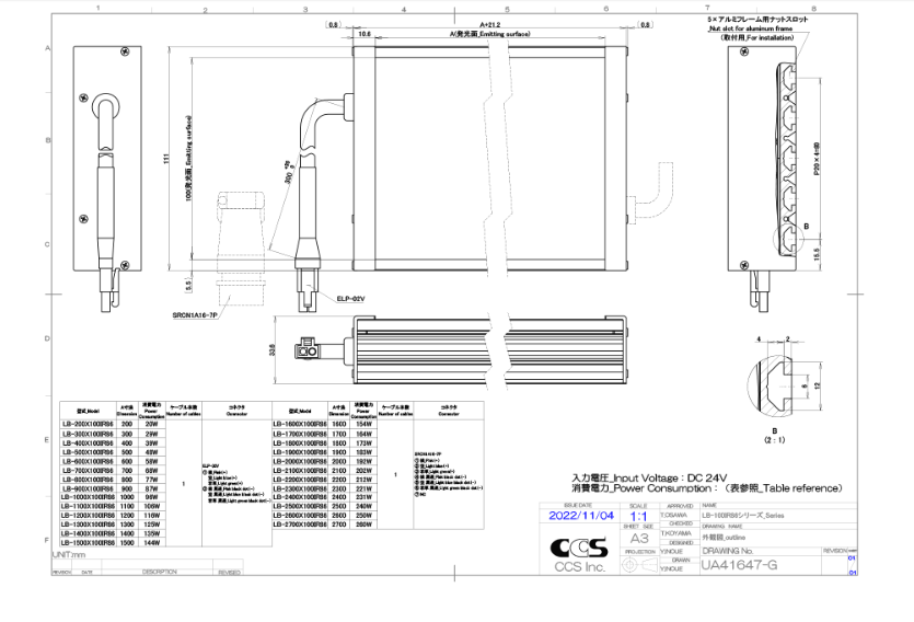CCS希希爱视 LB-1600X100IR86 条形光源 LED发光颜色 Infrared 峰值发光波长 860 nm 外观尺寸 W 1621.2 mm x D 111 mm x H 33.6 mm 输入电压 24 VDC 消耗功率 154 W 极性, 信号 1: (+), 2: (-) 线缆长度 300 mm 外壳材质 Aluminum alloy, Steel sheet 输入端口 ELP-02V 适合规格 CE, UKCA, RoHSIEC 62471 (Exempt) 使用温湿度 Temperature: 0 to 40°C, Humidity: 20 to 85%RH (with no condensation) 保存温湿度 Temperature: -20 to 60°C, Humidity: 20 to 85%RH (with no condensation) 冷却方式 Natural air-cooling 重量 4.13 kg 附属品 使用说明书 备注 LB-1600X100IR86 is made to order. Please contact your sales representative for details. 手机/微信:13682357734 电话:0755-84690029 QQ: 2844337877 邮箱:2844337877@qq.com...