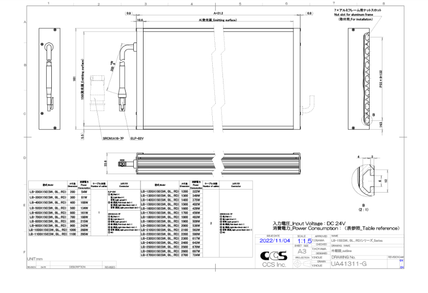 CCS希希爱视 LB-1500X150BL 条形光源 LED发光颜色 LB-1500X150RD: RedLB-1500X150SW: WhiteLB-1500X150BL: Blue 相关色温 LB-1500X150SW: 6300 K typ. 峰值发光波长 LB-1500X150RD: 630 nm typ.LB-1500X150BL: 467 nm typ. 外观尺寸 W 1521.2 mm x D 161 mm x H 33.6 mm 输入电压 24 VDC 消耗功率 402 W 极性, 信号 1, 2, 3: (+)/4, 5, 6: (-)/7: NC 线缆长度 300 mm 外壳材质 Aluminum alloy, Steel sheet 输入端口 SRCN1A16-7P 适合规格 CE, UKCA, RoHSIEC 624711LB-1500X150RD : ExemptLB-1500X150SW : ExemptLB-1500X150BL : Exempt 使用温湿度 Temperature: 0 to 40°C, Humidity: 20 to 85%RH (with no condensation) 保存温湿度 Temperature: -20 to 60°C, Humidity: 20 to 85%RH (with no condensation) 冷却方式 Natural air-cooling 重量 5.19 kg 附属品 使用说明书 备注 L...