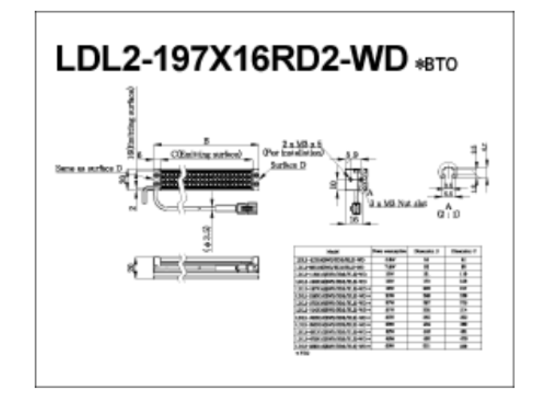 CCS希希爱视 LDL2-197X16RD2-WD 条形光源 LED发光颜色 Red 峰值发光波长 634 nm typ. 外观尺寸 W 209 mm x D 20 mm x H 20 mm 输入电压 24VDC 消耗功率 19 W max. 极性, 信号 1: (+), 2: NC, 3: (-) 线缆长度 300 mm 外壳材质 Aluminum alloy, resin 输入端口 SMR-03V-B 适合规格 CE, UKCA, RoHS, IEC 62471(Exempt) 使用温湿度 Temperature: 0 to 40°C, Humidity: 20 to 85%RH (no condensation) 保存温湿度 Temperature: -20 to 60°C, Humidity: 20 to 85%RH (no condensation) 冷却方式 Natural air cooling 重量 145 g 附属品 使用说明书 手机/微信:13682357734 电话:0755-84690029 QQ: 2844337877 邮箱:2844337877@qq.com...
