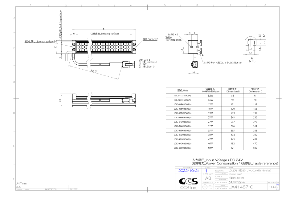 CCS希希爱视 LDL2-314X16SW2(A) 条形光源 LED发光颜色 White 相关色温 7,000 K typ. 外观尺寸 W 326 mm x D 20 mm x H 20 mm 输入电压 24VDC 消耗功率 31 W max. 极性, 信号 1: (+), 2: NC, 3: (-) 线缆长度 300 mm 外壳材质 Aluminum alloy, resin 输入端口 SMR-03V-B 适合规格 CE, UKCA, RoHS, IEC 62471(Low risk) 使用温湿度 Temperature: 0 to 40°C, Humidity: 20 to 85%RH (no condensation) 保存温湿度 Temperature: -20 to 60°C, Humidity: 20 to 85%RH (no condensation) 冷却方式 Natural air cooling 重量 220 g 附属品 使用说明书 手机/微信:13682357734 电话:0755-84690029 QQ: 2844337877 邮箱:2844337877@qq.com...
