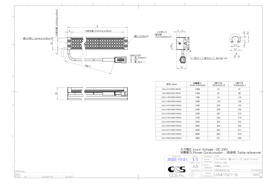 CCS希希爱视 LDL2-275X16SW2-WD(A) 条形光源 LED发光颜色 White 相关色温 7,000 K typ. 外观尺寸 W 287 mm x D 20 mm x H 20 mm 输入电压 24VDC 消耗功率 27 W max. 极性, 信号 1: (+), 2: NC, 3: (-) 线缆长度 300 mm 外壳材质 Aluminum alloy, resin 输入端口 SMR-03V-B 适合规格 CE, UKCA, RoHS, IEC 62471(Low risk) 使用温湿度 Temperature: 0 to 40°C, Humidity: 20 to 85%RH (no condensation) 保存温湿度 Temperature: -20 to 60°C, Humidity: 20 to 85%RH (no condensation) 冷却方式 Natural air cooling 重量 195 g 附属品 使用说明书 手机/微信:13682357734 电话:0755-84690029 QQ: 2844337877 邮箱:2844337877@qq.com...