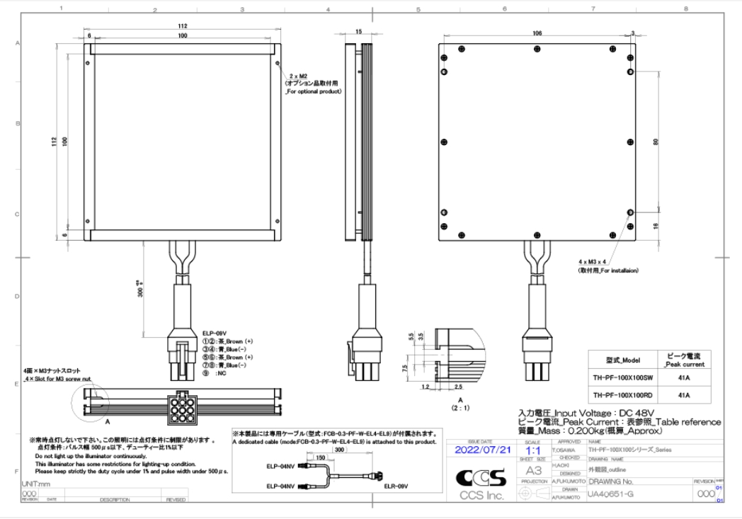 CCS希希爱视 TH-PF-100X100RD 平面光源 LED发光颜色 Red 峰值发光波长 625 nm typ. 外观尺寸 W 112 mm x D 112 mm x H 15 mm 峰值电流 41 A 输入电压 48 VDC max. 极性, 信号 1,2: (+) / 3,4: (-) / 5,6: (+) / 7,8: (-) / 9: NC 线缆长度 300 mm 外壳材质 Aluminum alloy, resin 输入端口 ELP-09V 适合规格 CE, UKCA, RoHS, IEC 62471(Exempt) 使用温湿度 Temperature: 0 to 40 °C, Humidity: 20 % to 85 %RH (with no condensation) 保存温湿度 Temperature: -20 to 60 °C, Humidity: 20 % to 85 %RH (with no condensation) 冷却方式 Natural air-cooling 重量 200 g 附属品 User Manual, 2-branch cable (Model: FCB-0.3-PF-W-EL4-EL9) 备注 Use the Light Unit within the lighting conditions (maximum strobe time: 500 μs, maximum duty cycle*: 1%).* The duty cycle is expressed by the following equation:Duty cycle (%) = 100 x Strobe time ...