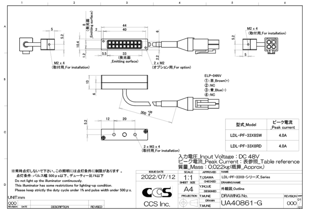 CCS希希爱视 LDL-PF-33X8RD 条形光源 LED发光颜色 Red 峰值发光波长 627 nm typ. 外观尺寸 W 44 mm x D 10.4 mm x H 13 mm 峰值电流 4.0 A 输入电压 48 VDC max. 极性, 信号 1: (+), 2: NC, 3: (-), 4: NC 线缆长度 300 mm 外壳材质 Aluminum alloy, resin 输入端口 ELP-04NV 适合规格 CE, UKCA, RoHS, IEC 62471(Exempt) 使用温湿度 Temperature: 0 to 40 °C, Humidity: 20 % to 85 %RH (with no condensation) 保存温湿度 Temperature: -20 to 60 °C, Humidity: 20 % to 85 %RH (with no condensation) 冷却方式 Natural air-cooling 重量 22 g 附属品 使用说明书 备注 Use the Light Unit within the lighting conditions (maximum strobe time: 500 μs, maximum duty cycle*: 1%).* The duty cycle is expressed by the following equation:Duty cycle (%) = 100 x Strobe time / Strobe cycle 手机/微信:13682357734 电话:0755-...