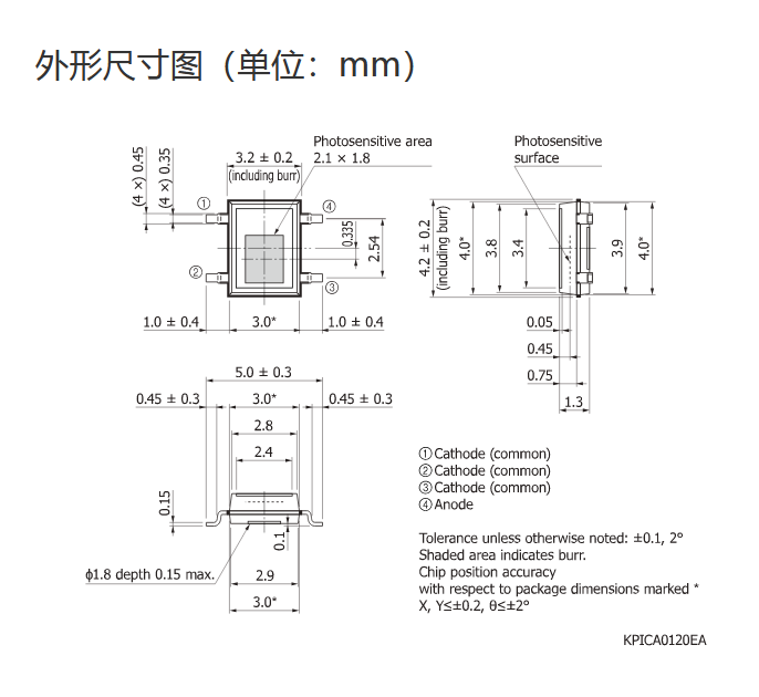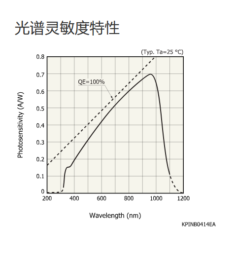 Ta = 25°C,典型值,感光灵敏度:λ = λp,暗电流:VR = 5 V,截止频率:VR = 5 V,RL = 50 Ω,-3 dB,结电容:VR = 5 V,f = 1 MHz,除非另有说明 |