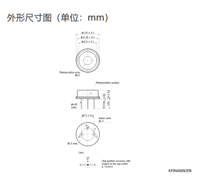 Ta = 25°C,典型值,感光灵敏度:λ = 1060 nm,暗电流:VR = 100 V,上升时间:VR = 100 V,RL = 50 Ω,λ = 1060 nm,10 ~ 90%,结电容:VR = 100 V,f = 10 kHz,除非另有说明 |