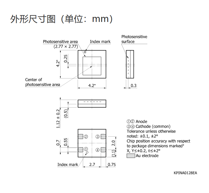 Ta = 25°C,典型值,感光灵敏度:λ = 960 nm,暗电流:VR = 12 V,截止频率:VR = 12 V,结电容:VR = 12 V,f = 1 MHz,除非另有说明 |