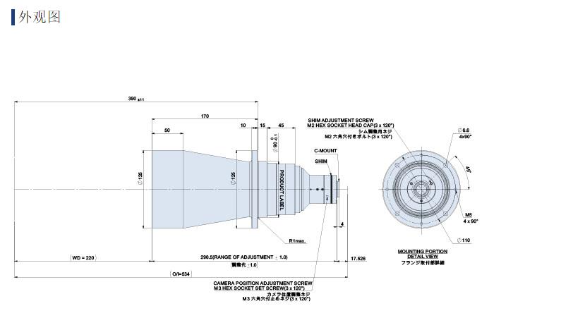MORITEX茉丽特 远心镜头 MTL-10011C-011 Spec MTL-10011C-011 z大IF (mm) 11 视野类型 (Φmm) 100 倍率. (x) 0.110 工作距离 (mm) 220 视场 1/3型 H 4.8 44 V 3.6 33 D 6 55 1/2型 H 6.4 58 V 4.8 44 D 8 73 1/1.8型 H 7.1 65 V 5.3 48 D 8.9 81 2/3型 H 8.8 80 V 6.6 60 D 11 100 光学规格 有效F值 8.0 畸变 (%) 0.01 远心度 (deg.) 0.03 分辨率@520nm (μm) 46.4 景深@40um (mm) 53.2 外观尺寸 外径 (Φmm) 125 镜筒长 (mm) 296.5 重量 (kg) 1.89 接口 C 0755-84690029 手机/微信:13682357734 QQ:2844337877...