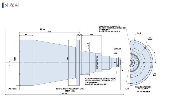 MORITEX茉丽特 远心镜头 MTL-19511C-006 Spec MTL-19511C-006 z大IF (mm) 11 视野类型 (Φmm) 195 倍率. (x) 0.056 工作距离 (mm) 365 视场 1/3型 H 4.8 85 V 3.6 64 D 6 106 1/2型 H 6.4 114 V 4.8 85 D 8 142 1/1.8型 H 7.1 126 V 5.3 94 D 8.9 158 2/3型 H 8.8 156 V 6.6 117 D 11 195 光学规格 有效F值 8.0 畸变 (%) -0.05 远心度 (deg.) 0.04 分辨率@520nm (μm) 90.6 景深@40um (mm) 202.6 外观尺寸 外径 (Φmm) 230 镜筒长 (mm) 505.8 重量 (kg) 7.95 接口 C 0755-84690029 手机/微信:13682357734 QQ:2844337877...