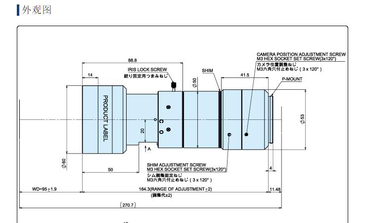 MORITEX茉丽特 远心镜头 MTL-3523P-066 Spec MTL-3523P-066 z大IF (mm) 23 视野类型 (Φmm) 35 倍率. (x) 0.655 工作距离 (mm) 95 视场 1/2型 H 6.4 10 V 4.8 7 D 8.0 12 2/3型 H 8.8 13 V 6.6 10 D 11.0 17 1.1型 H 14.1 22 V 10.3 16 D 18.1 27 4/3型 H 18.1 28 V 13.6 21 D 22.6 35 光学规格 有效F值 8.0 畸变 (%) -0.03 远心度 (deg.) 0.05 分辨率@520nm (μm) 7.7 景深@40um (mm) 1.5 外观尺寸 外径 (Φmm) 60 镜筒长 (mm) 164.3 重量 (kg) 0.55 接口 P 0755-84690029 手机/微信:13682357734 QQ:2844337877...