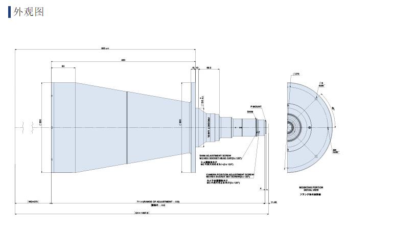 MORITEX茉丽特 远心镜头 MTL-24023P-010 Spec MTL-24023P-010 z大IF (mm) 23 视野类型 (Φmm) 240 倍率. (x) 0.096 工作距离 (mm) 375 视场 1/2型 H 6.4 67 V 4.8 50 D 8.0 83 2/3型 H 8.8 92 V 6.6 69 D 11.0 115 1.1型 H 14.1 147 V 10.3 108 D 18.1 183 4/3型 H 18.1 192 V 13.6 144 D 22.6 240 光学规格 有效F值 8.0 畸变 (%) 0.04 远心度 (deg.) 0.05 分辨率@520nm (μm) 52.9 景深@40um (mm) 69.5 外观尺寸 外径 (Φmm) 300 镜筒长 (mm) 711.5 重量 (kg) 15.5 接口 P 0755-84690029 手机/微信:13682357734 QQ:2844337877...