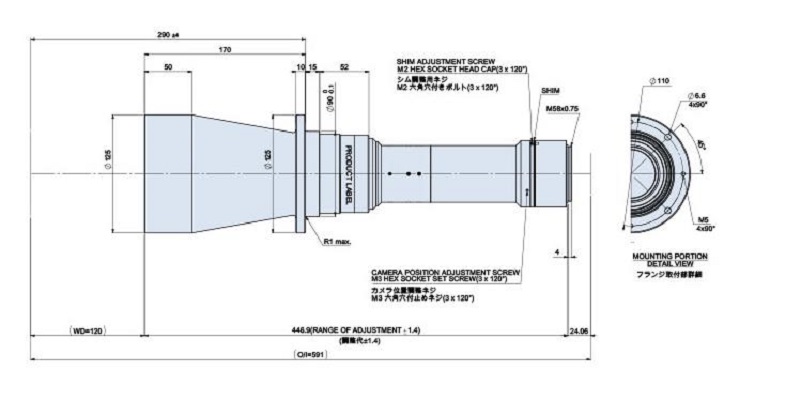 MORITEX茉丽特 远心镜头 MTL-9043M58-048 Spec MTL-9043M58-048 Z大IF (mm) 43.5 视野类型 (Φmm) 90 倍率. (x) 0.484 工作距离 (mm) 120 视场 1.1型 H 14.1 29 V 10.3 21 D 18.1 37 4/3型 H 18.1 37 V 13.6 28 D 22.6 47 35mm H 23 48 V 23 48 D 32.6 67 43.5mm H 36.2 75 V 24.1 50 D 43.5 90 光学规格 有效F值 13.7 畸变 (%) 0.02 远心度 (deg.) 0.03 分辨率@520nm (μm) 18 景深@40um (mm) 4.7 外观尺寸 外径 (Φmm) 125 镜筒长 (mm) 446.9 重量 (kg) 2.50 接口 M58 0755-84690029 手机/微信:13682357734 QQ:2844337877 邮箱:2844337877@qq.com...