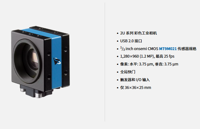 IMAGINGSOURCE映美精 工业相机 DMK 42BUC03 特性概要 动态范围 8 bit 视频格式 @ 帧率 (最大) 1,280×960 (1.2 MP) Y800 @ 25 fps1,280×960 (1.2 MP) RGB24 @ 25 fps 接口 (光学) 传感器类型 CMOS 传感器规格 onsemi MT9M021 快门 全局 规格 1/3 inch 像素 水平: 3.75 µm, 垂直: 3.75 µm 镜头接口 C/CS 接口 (电子) 接口 USB 2.0 (向前兼容) 供应电压 4.5 VDC 至 5.5 VDC 消耗电流 大约 250 mA @ 5 VDC 自动光圈控制 触发器 输入/输出 接口 (机械) 尺寸 高: 36 mm, 宽: 36 mm, 长: 25 mm 重量 70 g 调整 快门 1/10,000 s 至 30 s 增益 0 dB 至 18 dB 环境 温度 (作业) -5 °C 至 45 °C 温度 (储存) -20 °C 至 60 °C 湿度 (作业) 20 % 至 80 % (非冷凝) 湿度 (储存) 20 % 至 95 % (非冷凝) 0755-84690029 手机/微信:13682357734 QQ:2844337877 邮箱:2844337877@qq.com...