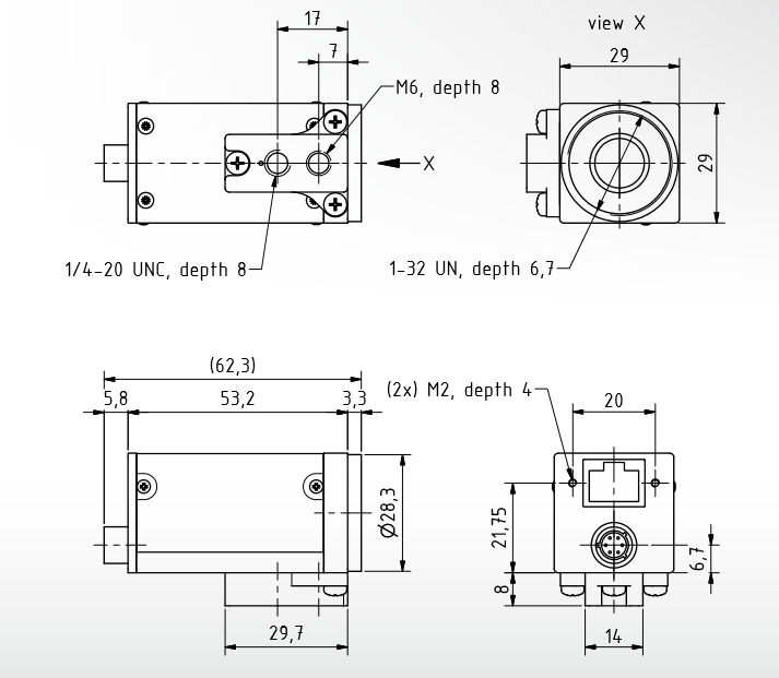 IMAGINGSOURCE映美精 工业相机 DFK 23GM021 特性概要 视觉标准 灵敏度 0.05 lx 动态范围 8/12 bit 视频格式 @ 帧率 (最大) 1,280×960 (1.2 MP) RGB32 @ 60 fps1,280×960 (1.2 MP) Y800 @ 60 fps1,280×960 (1.2 MP) Y16 @ 30 fps 接口 (光学) 传感器类型 CMOS 传感器规格 onsemi MT9M021 快门 全局 规格 1/3 inch 像素 水平: 3.75 µm, 垂直: 3.75 µm 镜头接口 C/CS 接口 (电子) 接口 GigE 供应电压 11 VDC 至 13 VDC 或乙太网路供电 48 VDC 至 56 VDC 消耗电流 大约 400 mA @ 12 VDC 自动光圈控制 触发器 输入/输出 接口 (机械) 尺寸 高: 29 mm, 宽: 29 mm, 长: 57 mm 重量 65 g 调整 快门 1/20,000 s 至 30 s 增益 0 dB 至 9 dB 环境 温度 (作业) -5 °C 至 45 °C 温度 (储存) -20 °C 至 60 °C 湿度 (作业) 20 % 至 80 % (非冷凝) 湿度 (储存) 20 % 至 95 % (非冷凝) 0755-84690029 手机/微信:136823577...