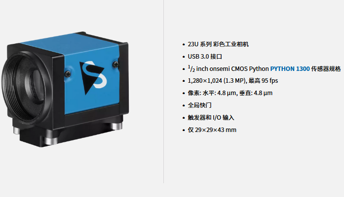 IMAGINGSOURCE映美精 工业相机 DFK 23UP1300 特性概要 灵敏度 0.05 lx 动态范围 8/12 bit 视频格式 @ 帧率 (最大) 1,280×960 (1.2 MP) RGB32 @ 60 fps1,280×960 (1.2 MP) Y800 @ 60 fps1,280×960 (1.2 MP) Y16 @ 30 fps 接口 (光学) 传感器类型 CMOS 传感器规格 onsemi MT9M021 快门 全局 规格 1/3 inch 像素 水平: 3.75 µm, 垂直: 3.75 µm 镜头接口 C/CS 接口 (电子) 接口 USB 3.0 供应电压 4.5 VDC 至 5.5 VDC 消耗电流 大约 250 mA @ 5 VDC 自动光圈控制 触发器 输入/输出 接口 (机械) 尺寸 高: 29 mm, 宽: 29 mm, 长: 43 mm 重量 65 g 调整 快门 0.1 ms 至 1 s 增益 0 dB 至 9 dB 环境 温度 (作业) -5 °C 至 45 °C 温度 (储存) -20 °C 至 60 °C 湿度 (作业) 20 % 至 80 % (非冷凝) 湿度 (储存) 20 % 至 95 % (非冷凝) 0755-84690029 手机/微信:13682357734 QQ:2844337877 邮箱:2844337877@qq.com...
