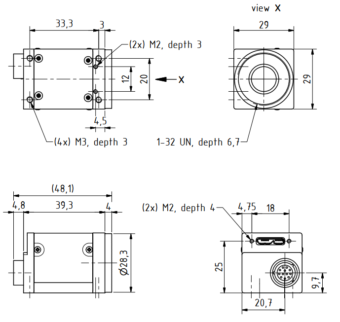 IMAGINGSOURCE映美精 工业相机 DMK 23UX249 特性概要 灵敏度 0.05 lx 动态范围 8/12 bit 视频格式 @ 帧率 (最大) 1,920×1,200 (2.3 MP) Y800 @ 30 fps1,920×1,200 (2.3 MP) Y16 @ 15 fps 接口 (光学) 传感器类型 CMOS Pregius 传感器规格 Sony IMX249LLJ 快门 全局 规格 1/1.2 inch 像素 水平: 5.86 µm, 垂直: 5.86 µm 镜头接口 C/CS 接口 (电子) 接口 USB 3.0 供应电压 4.5 VDC 至 5.5 VDC 消耗电流 大约 250 mA @ 5 VDC 自动光圈控制 触发器 输入/输出 接口 (机械) 尺寸 高: 29 mm, 宽: 29 mm, 长: 43 mm 重量 65 g 调整 快门 1/100,000 s 至 30 s 增益 0 dB 至 36 dB 环境 温度 (作业) -5 °C 至 45 °C 温度 (储存) -20 °C 至 60 °C 湿度 (作业) 20 % 至 80 % (非冷凝) 湿度 (储存) 20 % 至 95 % (非冷凝) 0755-84690029 手机/微信:13682357734 QQ:2844337877 邮箱:2844337877@qq.com...