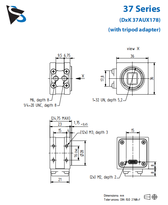 IMAGINGSOURCE映美精 工业相机 DMK 37AUX290 特性概要 视觉标准 USB3 动态范围 10 bit 分辨率 1,920×1,080 (2.1 MP) 帧率 143 fps 视频输出格式 8-Bit Monochrome, 16-Bit Monochrome 接口 (光学) 传感器类型 CMOS STARVIS 传感器规格 Sony IMX290 快门 卷帘 规格 1/2.8 inch 像素 水平: 2.9 µm, 垂直: 2.9 µm 镜头接口 C/CS 接口 (电子) 接口 USB 3.1 供应电压 4.75 VDC 至 5.25 VDC 消耗电流 大约 260 mA @ 5 VDC 自动光圈控制 触发器 输入/输出 接口 (机械) 尺寸 高: 36 mm, 宽: 36 mm, 长: 25 mm 重量 70 g 调整 快门 20 µs 至 30 s 增益 0 dB 至 72 dB 环境 温度 (作业) -5 °C 至 45 °C 温度 (储存) -20 °C 至 60 °C 湿度 (作业) 20 % 至 80 % (非冷凝) 湿度 (储存) 20 % 至 95 % (非冷凝) 0755-84690029 手机/微信:13682357734 QQ:2844337877 邮箱:2844337877@qq.com...