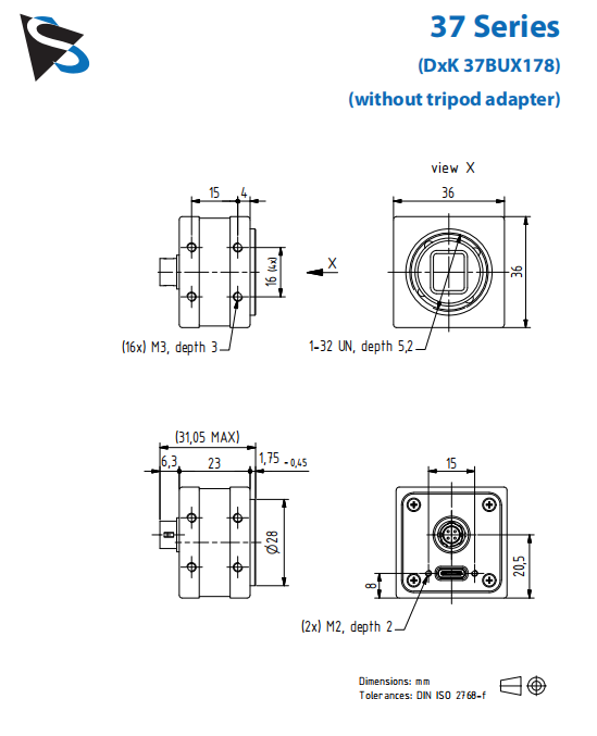 IMAGINGSOURCE映美精 工业相机 DMK 37BUX264 特性概要 视觉标准 USB3 动态范围 12 bit 分辨率 2,448×2,048 (5 MP) 帧率 38 fps 视频输出格式 8-Bit Monochrome, 16-Bit Monochrome 接口 (光学) 传感器类型 CMOS Pregius 传感器规格 Sony IMX264 快门 全局 规格 2/3 inch 像素 水平: 3.45 µm, 垂直: 3.45 µm 镜头接口 C/CS 接口 (电子) 接口 USB 3.1 供应电压 4.75 VDC 至 5.25 VDC 消耗电流 大约 360 mA @ 5 VDC 自动光圈控制 触发器 输入/输出 接口 (机械) 尺寸 高: 42 mm, 宽: 42 mm, 长: 25 mm 重量 76 g 调整 快门 1 µs 至 4 s 增益 0 dB 至 48 dB 环境 温度 (作业) -5 °C 至 45 °C 温度 (储存) -20 °C 至 60 °C 湿度 (作业) 20 % 至 80 % (非冷凝) 湿度 (储存) 20 % 至 95 % (非冷凝) 0755-84690029 手机/微信:13682357734 QQ:2844337877 邮箱:2844337877@qq.com...