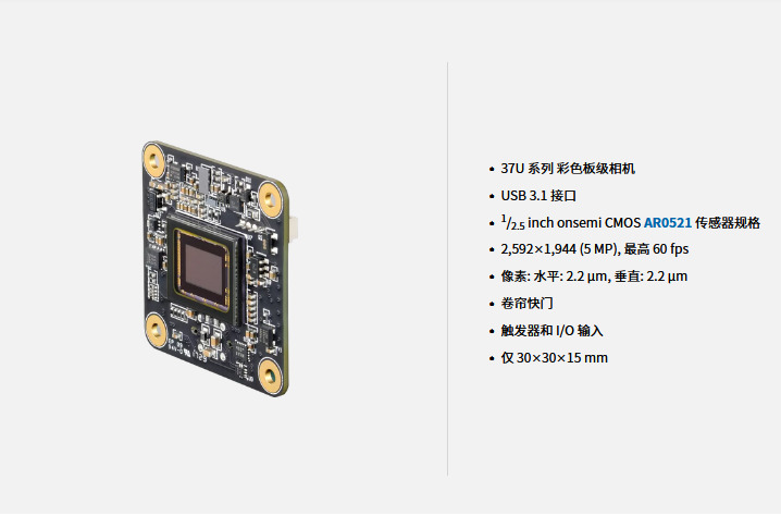 IMAGINGSOURCE映美精 工业相机 DFM 37UR0521-ML 特性概要 视觉标准 动态范围 12 bit 分辨率 2,592×1,944 (5 MP) 帧率 60 fps 视频输出格式 8-Bit Bayer (GR), 10-Bit Bayer Packed (GR), 16-Bit Bayer (GR) 接口 (光学) 传感器类型 CMOS 传感器规格 onsemi AR0521 快门 卷帘 规格 1/2.5 inch 像素 水平: 2.2 µm, 垂直: 2.2 µm 镜头接口 M12x0.5 接口 (电子) 接口 USB 3.1 供应电压 4.75 VDC 至 5.25 VDC 消耗电流 大约 tbd mA @ 5 VDC 自动光圈控制 触发器 输入/输出 接口 (机械) 尺寸 高: 30 mm, 宽: 30 mm, 长: 15 mm 重量 7 g 调整 快门 100 µs 至 30 s 增益 0 dB 至 9.75 dB 环境 温度 (作业) -5 °C 至 45 °C 温度 (储存) -20 °C 至 60 °C 湿度 (作业) 20 % 至 80 % (非冷凝) 湿度 (储存) 20 % 至 95 % (非冷凝) 0755-84690029 手机/微信:13682357734 QQ:2844337877 邮箱:2844337877@qq.com...