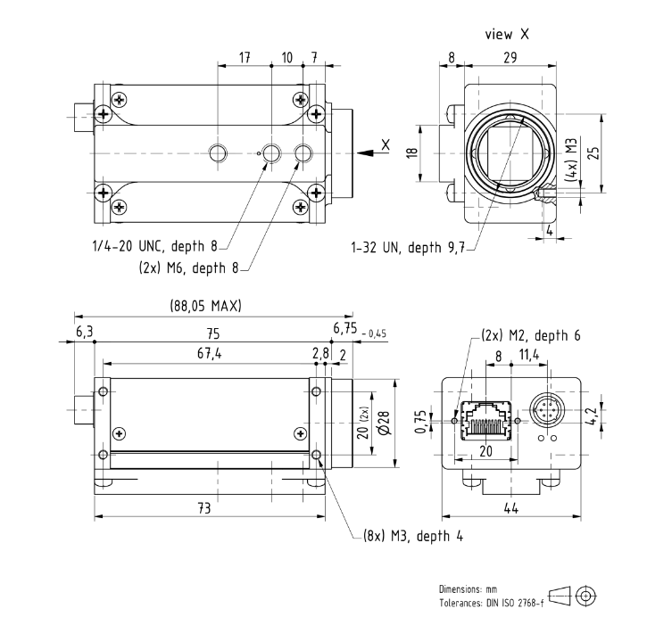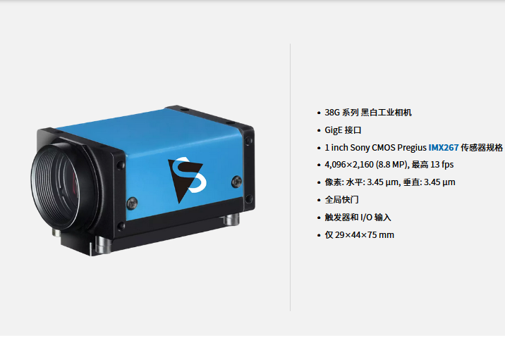 IMAGINGSOURCE映美精 工业相机 DMK 38GX267-a 特性概要 视觉标准 动态范围 12 bit 分辨率 4,096×2,160 (8.8 MP) 帧率 13 fps 视频输出格式 8-Bit Monochrome, 12-Bit Packed Monochrome, 16-Bit Monochrome 接口 (光学) 传感器类型 CMOS Pregius 传感器规格 Sony IMX267 快门 全局 规格 1 inch 像素 水平: 3.45 µm, 垂直: 3.45 µm 镜头接口 C (CS可选) 接口 (电子) 接口 Gigabit Ethernet (RJ45) 供应电压 9 VDC 至 27 VDC 或乙太网路供电 48 VDC 至 56 VDC 消耗电流 大约 400 mA @ 12 VDC 自动光圈控制 触发器 输入/输出 接口 (机械) 尺寸 高: 29 mm, 宽: 44 mm, 长: 75 mm 重量 165 g 调整 快门 2 µs 至 4 s 增益 0 dB 至 48 dB 环境 温度 (作业) -5 °C 至 45 °C 温度 (储存) -20 °C 至 60 °C 湿度 (作业) 20 % 至 80 % (非冷凝) 湿度 (储存) 20 % 至 95 % (非冷凝) 0755-84690029 手机/微信:13682357734 &nbs...