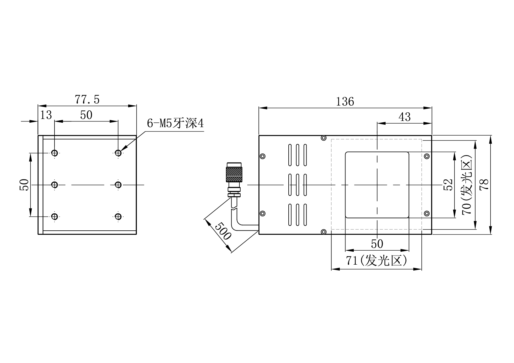IRAYPLE 大华华睿 PFM-TZH70W-3A2 工业光源 基本参数 型号 PFM-TZH70W-3A2 类型 高亮同轴光源 颜色 白色 色温 6000 -6500K 功率 53 W 输入电压 DC48V 线缆长度 500 mm 外部接口 光源接口 φ12-7芯(1正,2负,风扇:3正,4负,567检测-) 结构参数 发光面尺寸 70×71 mm 产品尺寸 136×78×77.5 mm 环境参数 工作温度 0~40℃ 工作湿度 20~85%RH(非凝结) 储存温度 -20~60℃ 储存湿度 20~85%RH(非凝结) 手机/微信:13682357734 电话:0755-84690029 QQ:2844337877 邮箱:2844337877@qq.com...