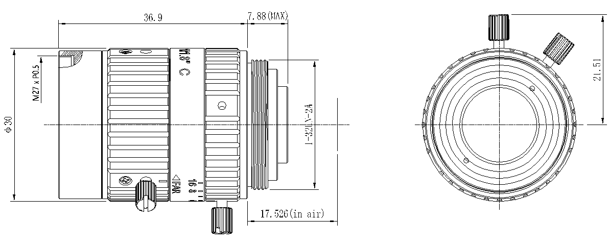 IRAYPLE 大华华睿 A9-1628-6MP 面阵镜头 基本参数 系列 A9-6MP系列 型号 A9-1628-6MP 镜头焦距 16 mm 光圈孔径 F2.8 - 16 像面尺寸 Ф9.4 mm(1/1.8") 对焦范围 0.1m to infinite 光学畸变 0.001 TV畸变 0.00050 视场角 30.2°×24.6°×18.2°(9 mm×7.4 mm×4.9 mm) 相对照度 85% (F2.8); 95% (F4.0) 主光线入射角 7.7° 光谱范围 436 nm~656 nm 光谱透过率 T> 85% 净重 56±5 g 结构 安装接口 C口 滤镜接口 M27×P0.5 对焦方式 手动调节 光圈控制 手动调节 产品尺寸 36.9×Ф30 mm 环境 工作温度 -20°C~+50°C 手机/微信:13682357734 电话:0755-84690029 QQ:2844337877 邮箱:2844337877@qq.com...