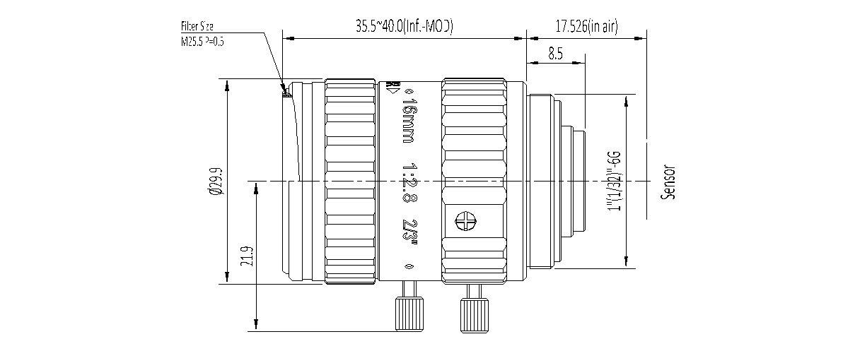 IRAYPLE 大华华睿 MK1628M 面阵镜头 基本参数 系列 MK-M系列 型号 MK1628M 镜头焦距 16mm 光圈孔径 F2.8 - F16 像面尺寸 Ф11.4mm(2/3") 对焦范围 0.1m to infinite 光学畸变 -0.60% TV畸变 -0.20% 视场角 37.9°x30.8°x23.3°(11mmx8.5mmx7.12mm) 相对照度 63% (F2.8); 88% (F4.0) 主光线入射角 8.53° 光谱范围 400nm~700nm 光谱透过率 T>85% 净重 58 g 结构 安装接口 C口 滤镜接口 M25.5xP0.5 对焦方式 手动调节 光圈控制 手动调节 产品尺寸 35.55mmxФ30mm 环境 工作温度 -20°C ~ +50°C 手机/微信:13682357734 电话:0755-84690029 QQ:2844337877 邮箱:2844337877@qq.com...