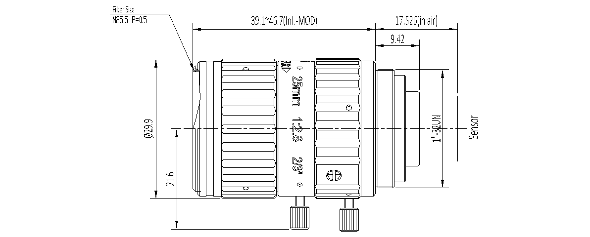 IRAYPLE 大华华睿 MK2528M 面阵镜头 基本参数 系列 MK-M系列 型号 MK2528M 镜头焦距 25mm 光圈孔径 F2.8 - F16 像面尺寸 Ф11.4mm(2/3") 对焦范围 0.15m to infinite 光学畸变 -0.30% TV畸变 -0.30% 视场角 24.8°x20.0°x15.0°(11mmx8.5mmx7.12mm) 相对照度 75% (F2.8); 95% (F4.0) 主光线入射角 9.8° 光谱范围 400nm~700nm 光谱透过率 T>85% 净重 66 g 结构 安装接口 C口 滤镜接口 M25.5xP0.5 对焦方式 手动调节 光圈控制 手动调节 产品尺寸 36mmxФ30mm 环境 工作温度 -20°C ~ +50°C 手机/微信:13682357734 电话:0755-84690029 QQ:2844337877 邮箱:2844337877@qq.com...