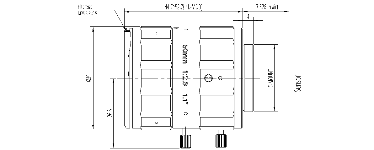 IRAYPLE 大华华睿 MT5028X 面阵镜头 基本参数 系列 MT-X系列 型号 MT5028X 镜头焦距 50mm 光圈孔径 F2.8 - F16 像面尺寸 Ф17.6mm(1.1") 对焦范围 0.25m to infinite 光学畸变 0.17% TV畸变 0.07% 视场角 20°x16.2°x11.9°(17.6mmx14.08mmx10.56mm) 相对照度 92% (F2.8); 98% (F4.0) 主光线入射角 8.65° 光谱范围 436nm~656nm 光谱透过率 T>85% 净重 117 g 结构 安装接口 C口 滤镜接口 M35.5xP0.5 对焦方式 手动调节 光圈控制 手动调节 产品尺寸 44.7mmxФ39mm 环境 工作温度 -20°C ~ +50°C 手机/微信:13682357734 电话:0755-84690029 QQ:2844337877 邮箱:2844337877@qq.com...
