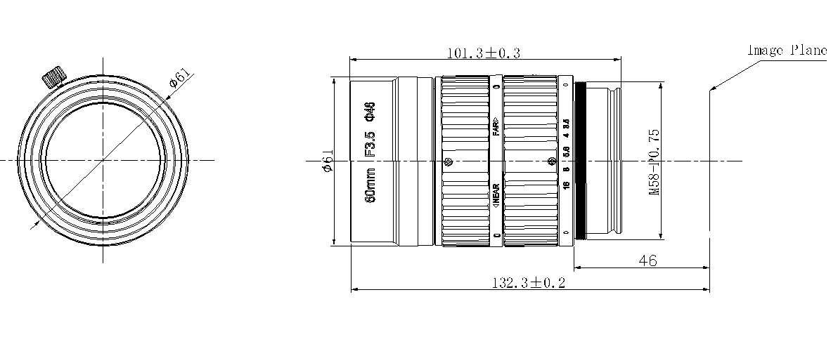 IRAYPLE 大华华睿 F46-6035-M58 面阵镜头 基本参数 系列 MF-M系列 型号 F46-6035-M58 镜头焦距 60mm 光圈孔径 F3.5 - F16 像面尺寸 Ф46mm 对焦范围 0.32m to infinite 光学畸变 -0.2% TV畸变 -0.08% 视场角 33°x26.6°x20.2° (43.5mm x 36.2mm x 24.1mm) 相对照度 73% (F4.3); 83% (F4.0) 主光线入射角 8.3° 光谱范围 436nm~656nm 光谱透过率 T>85% 净重 503 g 结构 安装接口 T>85% 滤镜接口 无 对焦方式 手动调节 光圈控制 手动调节 产品尺寸 101.3xФ61mm 环境 工作温度 -20°C ~ +50°C 手机/微信:13682357734 电话:0755-84690029 QQ:2844337877 邮箱:2844337877@qq.com...
