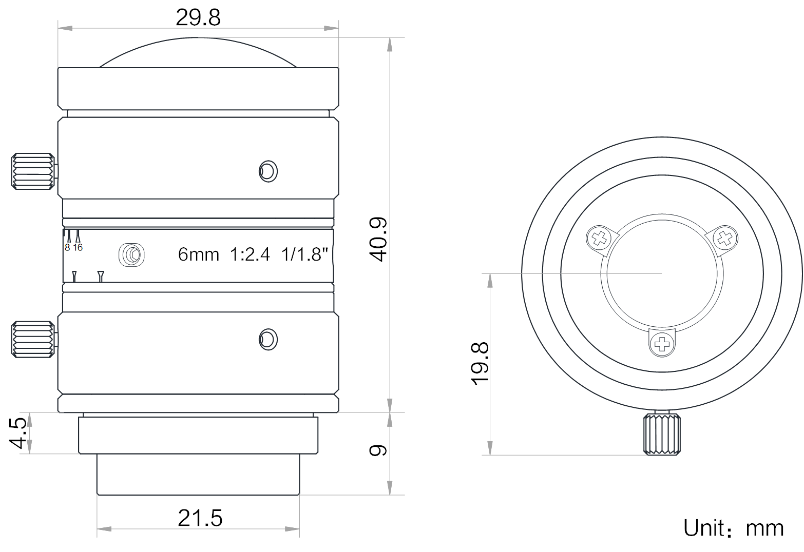 | 名称 | 6mm,F2.4,1/1.8",1000万分辨率,C接口镜头 | |