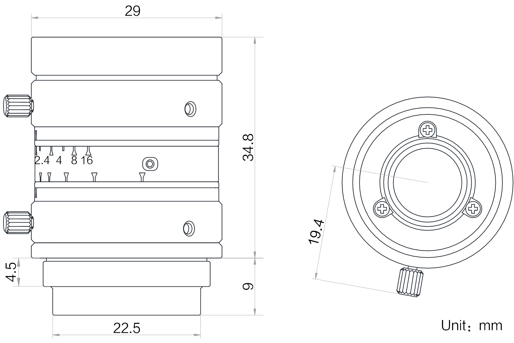 | 名称 | 8mm,F2.4,1/1.8",1000万分辨率,C接口镜头 | |