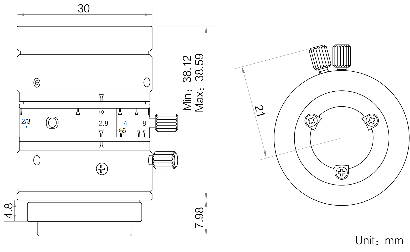 | 名称 | 25mm,F2.8,2/3",800万分辨率,C接口镜头 | |