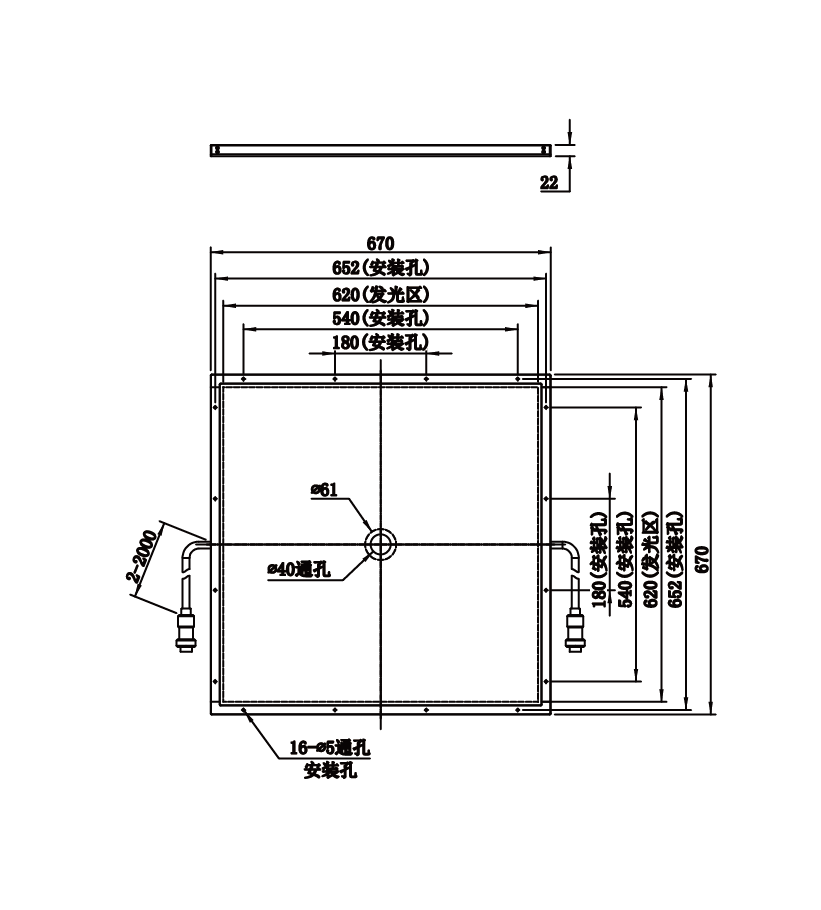 | 外形尺寸 | 670 mm × 670 mm × 22 mm | |