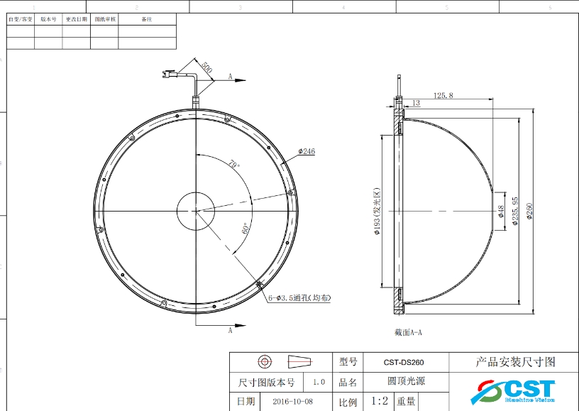 CST 康视达 CST-DS260-W 圆顶光源 产品型号 CST-DS260-W 光源颜色 白色 光源功率 38W 色温/波长 6000-6500K 保存环境 温度:-20-60℃ 湿度:20-85%RH(非凝结) 使用环境 温度:0-40℃ 使用寿命 环境为25℃时,红色以50%照度连续工作60000小时, 衰减量为50% 环境为25℃时,白色以50%照度连续工作30000小时, 衰减量为50% 品质保证 CST产品自出货日起1年,非人为原因发生故障,免费提供维修或更换服务 手机/微信:13682357734 电话:0755-84690029 QQ:2844337877 邮箱:2844337877@qq.com...